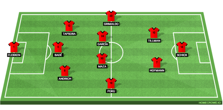 Probable Lineup (3-4-2-1): Flekken; Andrich, Bade, Tapsoba; Poku, Maza, García, Grimaldo; Hofmann, Tillman; Schick