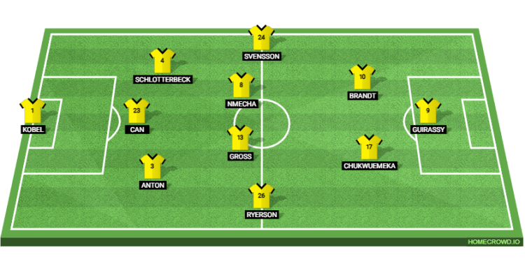 Probable Lineup (3-4-2-1): Kobel; Anton, Can, Schlotterbeck; Ryerson, Gross, Nmecha, Svensson; Chukwuemeka, Brandt; Guirassy